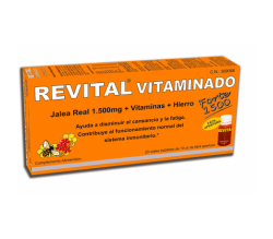 Revital Vitaminado Forte es un complemento alimenticio a base e Jalea Real, Vitaminas B3, B5, B6, B12, C y Hierro que ayuda a disminuir el cansancio y la fatiga y Vitaminas A, B6, B12, C y D que contribuyen al funcionamiento normal del sistema inmunitario.