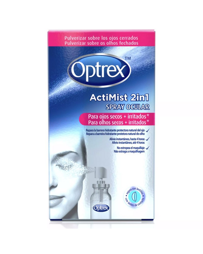 Optrex Actimist Spray Ojos Secos E Irritados hidrata y calma la sequedad ocular, con los ojos cerrados. Alivia y repara la barrera protectora hidratante del ojo, de forma natural y segura, sin estropear el maquillaje. Facil y cómodo de aplicar, proporciona 4 horas de alivio ocular.