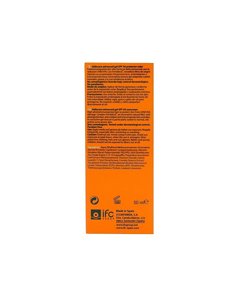 Heliocare Gel SPF 50 es un fotoinmunoprotector con ingredientes antioxidantes y reparadores del daño solar con textura gel, sin alcohol, que se absorbe fácilmente y no deja restos blanquecinos sobre la piel.Su fórmula, con la exclusiva tecnología patentada Fernblock® y la combinación de filtros de tecnología avanzada, asegura una gran cobertura frente al sol y previene, incluso, sus efectos a largo plazo (manchas, fotoenvejecimiento cutáneo...).BENEFICIOSFotoprotección con ingredientes antioxidantes y reparadores para completar el efecto fotoprotector de los filtros frente al daño solar.Textura en gel ligera de rápida absorción y no grasa.No comedogénico.No contiene alcohol. No reseca la piel.Gel fotoinmunoprotector no comedogénico, fácil de absorber y que no deja restos blanquecinos sobre la piel evitando los problemas del exceso de grasa. Está formulado con la exclusiva tecnología solar patentada Fernblock® y la combinación de filtros más avanzados, que aseguran la mayor cobertura frente a los efectos nocivos de los rayos solares sobre la piel.Heliocare® 50 Gel está especialmente indicado para pieles normales y grasas.Es el único que encontrarás disponible en formato de 200 mg, además de en tubo de 50 mg. Para que disfrutes del sol protegiendo todo tu cuerpo.